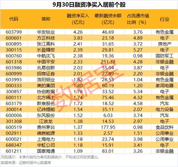 具體到個(gè)股,9月30日獲融資凈買入千萬(wàn)元以上的有278只,其中21只融資凈買入額超億元。華友鈷業(yè)(603799)融資凈買入額居首,當(dāng)日凈買入4.26億元;其次是方正科技(600601)、張江高科(600895),融資凈買入金額分別為3.83億元、2.41億元;融資凈買入金額居前的還有長(zhǎng)盈精密(300115)、中航沈飛(600760)、中國(guó)平安(601318)等。