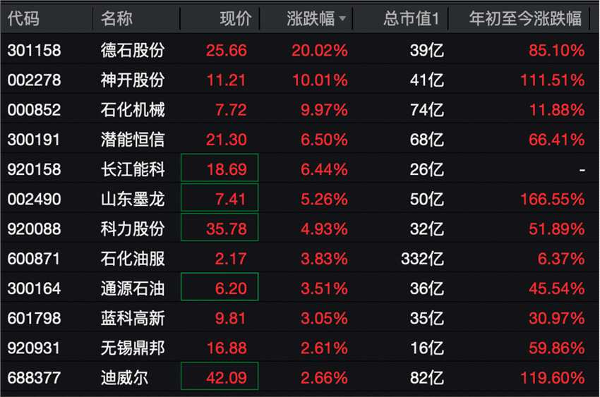 德石股份開盤不到1分鐘即沖上20cm漲停,神開股份、石化機械(000852)競價漲停,中海油服、潛能恒信等跟漲。