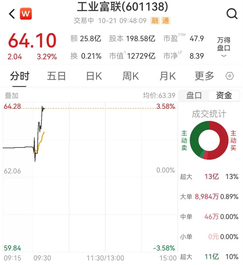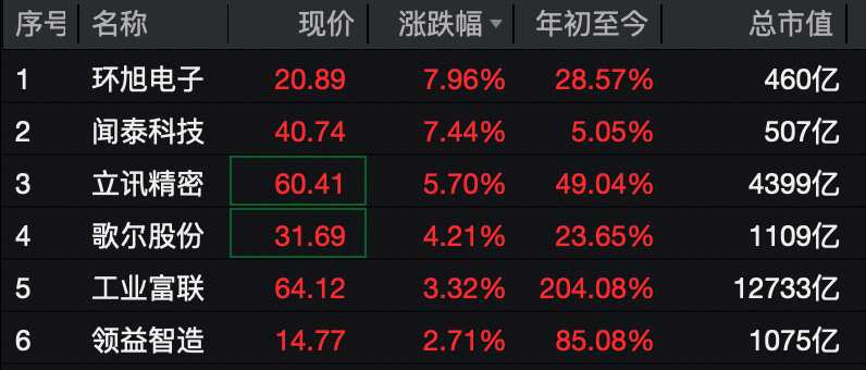 矩子科技漲超10%,聞泰科技漲超7%,立訊精密漲超5%,工業(yè)富聯(lián)漲超3%。