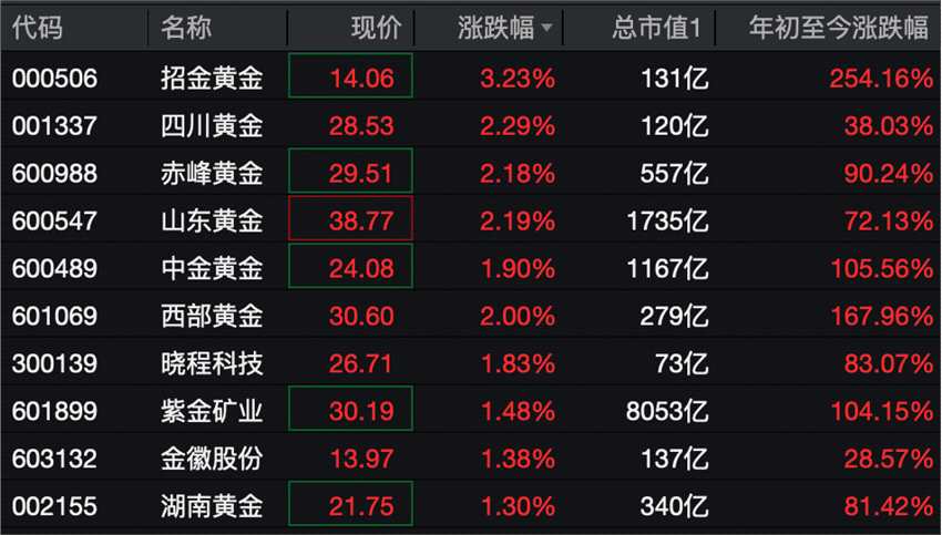 個股方面,【招金黃金(000506)、股吧】漲逾3%,四川黃金、赤峰黃金、山東黃金、中金黃金、西部黃金等相關個股紛紛飄紅。