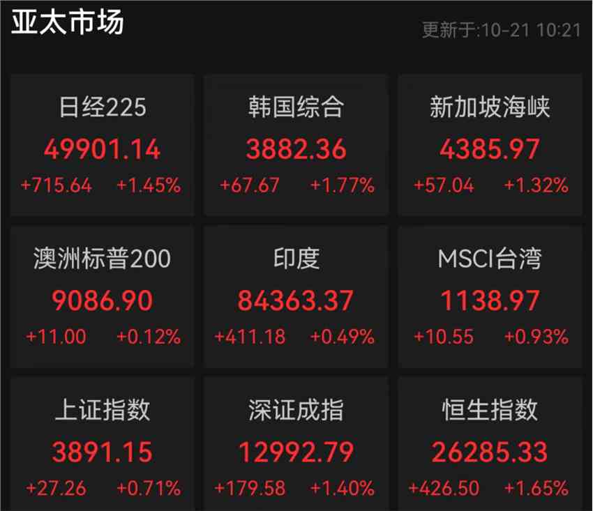10月21日早盤,亞太市場(chǎng)集體爆發(fā)。A股盤初三大指數(shù)集體上漲,多個(gè)板塊異動(dòng)拉升。