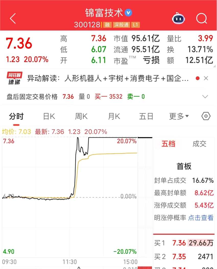 人形機(jī)器人概念表現(xiàn)活躍。午后開盤約13分鐘,龍頭股錦富技術(shù)(300128)便由午間收盤時(shí)的下跌,直線拉升至“20CM”漲停,后雖短暫開板,但很快再次回封漲停直至收盤。