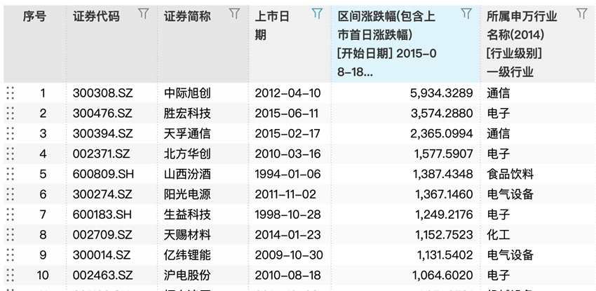時代財經(jīng)梳理發(fā)現(xiàn),自2015年滬指高點以來的10年間,2015年8月18日前上市的個股中,(截至2025年10月28日收盤)漲幅前10的標的漲幅均超10倍。其中,中際旭創(chuàng)(300308)(300308.SZ)、勝宏科技(300476)(300476.SZ)、天孚通信(300394)(300394.SZ)漲幅居前三,電子、通信、電氣設(shè)備三大行業(yè)占比達 80%,印證了科技板塊的長期成長邏輯。