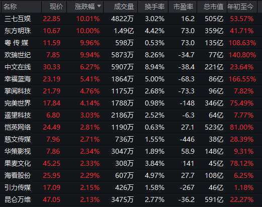 短劇游戲概念股快速拉升,三七互娛(002555)、東方明珠、歡瑞世紀(jì)(000892)、粵傳媒(002181)等多股漲停,中文在線(300364)、幸福藍(lán)海(300528)、掌閱科技(603533)等跟漲。