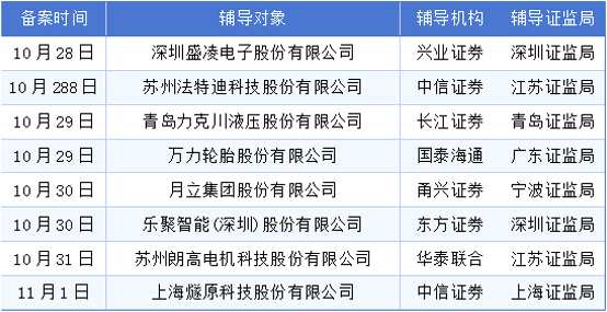 10月27日至11月2日期間新增輔導(dǎo)備案企業(yè)8家,分別為深圳盛凌電子股份有限公司、蘇州法特迪科技股份有限公司、青島力克川液壓股份有限公司、萬(wàn)力輪胎股份有限公司、月立集團(tuán)股份有限公司、樂(lè)聚智能(深圳)股份有限公司、蘇州朗高電機(jī)科技股份有限公司、上海燧原科技股份有限公司。