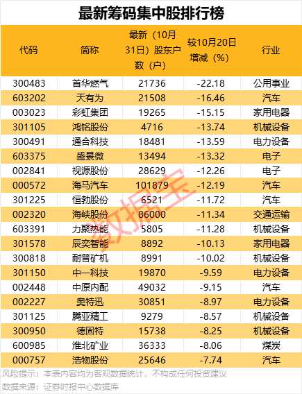 股東戶數(shù)降幅最多的是首華燃氣(300483),截至10月31日股東戶數(shù)為21736戶,較10月20日下降22.18%;其次是天有為(603202)、彩虹集團(003023),股東戶數(shù)環(huán)比分別下降16.46%、15.15%。