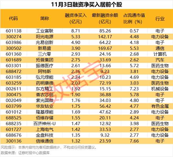 具體到個股,11月3日獲融資凈買入千萬元以上的有583只,其中35只融資凈買入額超1億元。工業(yè)富聯(lián)(601138)融資凈買入額居首,當日凈買入8.71億元;其次是陽光電源(300274)、兆易創(chuàng)新(603986),融資凈買入金額分別為5.33億元、4.90億元,融資凈買入金額居前的還有新易盛(300502)、三六零(601360)、拓普集團(601689)等。
