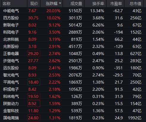 電網(wǎng)設(shè)備板塊盤初拉升,中能電氣(300062)20%漲停,四方股份(601126)漲停,新聯(lián)電子(002546)、科陸電子(002121)、北京科銳(002350)等跟漲。