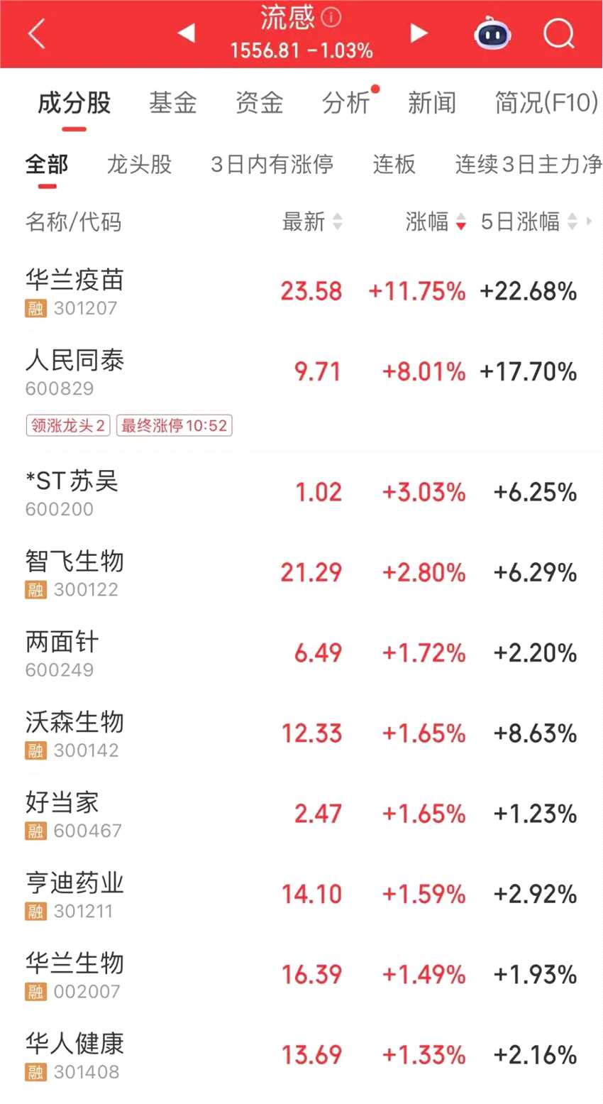 午后,抗流感概念局部異動(dòng),華蘭疫苗(301207)漲超11%,智飛生物(300122)等跟漲。