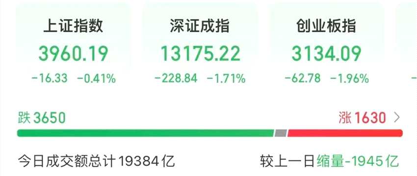 截至收盤(pán),上證指數(shù)下跌0.41%,深證成指下跌1.71%,創(chuàng)業(yè)板指下跌1.96%。市場(chǎng)全天成交額為19384億元,較前一日縮量1945億元。冰雪產(chǎn)業(yè)概念股午后持續(xù)拉升,大連圣亞(600593)漲停,創(chuàng)歷史新高。貴金屬、醫(yī)藥、機(jī)器人等板塊跌幅居前。
