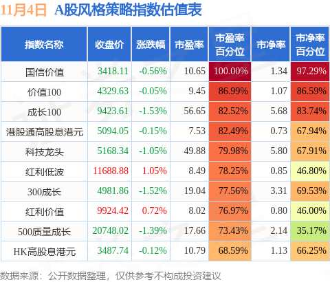 風(fēng)格策略指數(shù)方面,國(guó)信價(jià)值的市盈率百分位較高,為100.0%。而HK高股息港元的市盈率百分位較低,為68.59%。