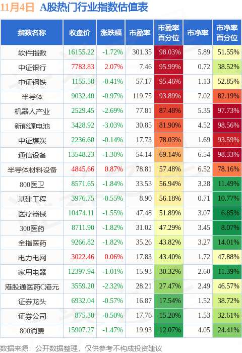 熱門行業(yè)指數(shù)方面,軟件指數(shù)的市盈率百分位較高,為98.03%。而800消費(fèi)的市盈率百分位較低,為12.07%。