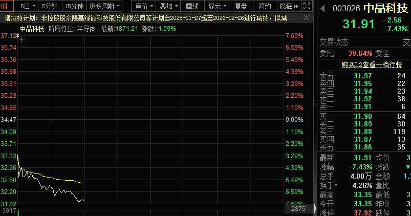 中晶科技持股6.06%的股東隆基綠能(601012)計劃減持公司股份不超過387.64萬股,占公司總股本的3%,董事郭兵健計劃減持不超過85.47萬股,占公司總股本的0.66%。上述減持主體合計減持公司股份不超3.66%。