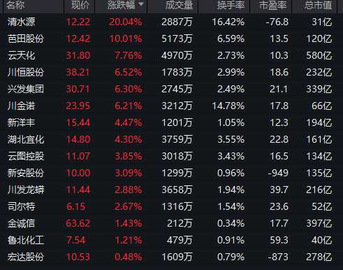磷化工概念盤中異動拉升,清水源(300437)盤中直線拉漲停,芭田股份(002170)漲停,云天化(600096)、川恒股份(002895)、川金諾(300505)等跟漲。
