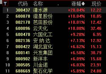 具體個股方面,磷化工概念股清水源(300437)、云天化(600096)、澄星股份(600078)、芭田股份(002170)四只個股漲停。