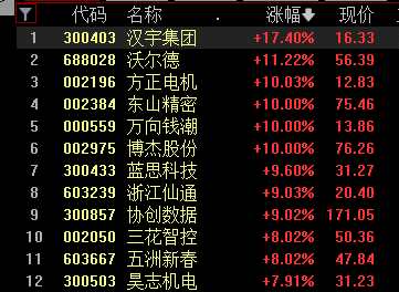 人形機器人概念同樣爆發(fā),漢宇集團(300403)大漲17%,方正電機(002196)、東山精密(002384)、萬向錢潮(000559)等個股漲停,三花智控(002050)漲幅超8%。