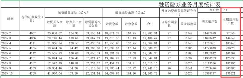 從2025年的月度數(shù)據(jù)明細來看,兩融新開戶數(shù)并非線性增長,而是呈現(xiàn)明顯的波動性:1月新開7萬戶;2月升至9.74萬戶;3月達到一個小高峰14.45萬戶;4月回落至10.59萬戶;5月進一步降至8.87萬戶;6月回升至10.14萬戶;7月繼續(xù)增長至12.36萬戶;8月大幅躍升至18.3萬戶;9月則達到年內(nèi)迄今的高點20.54萬戶。10月的回落可視作在連續(xù)兩個月高增長后的正常調(diào)整。