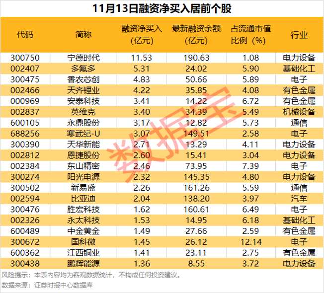 具體到個(gè)股,11月13日獲融資凈買入1億元以上的有38只,其中,8只融資凈買入額均超3億元。