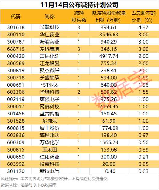 11月14日,21家公司發(fā)布了減持計(jì)劃。長(zhǎng)聯(lián)科技(301618)、華仁藥業(yè)(300110)、海能實(shí)業(yè)(300787)等擬減持比例居前。