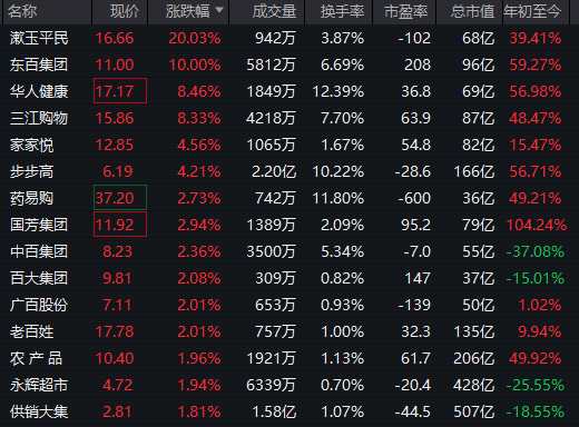 大消費(fèi)板塊走強(qiáng),零售、免稅、紡織服裝等方向拉升,漱玉平民(301017)20%漲停,東百集團(tuán)(600693)直線拉漲停,實(shí)現(xiàn)8天6板。