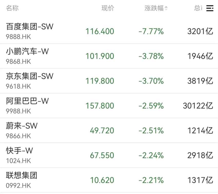 港股方面,三大指數(shù)悉數(shù)下跌,百度集團(tuán)跌超7%,小鵬汽車、京東集團(tuán)、阿里巴巴等跟跌。