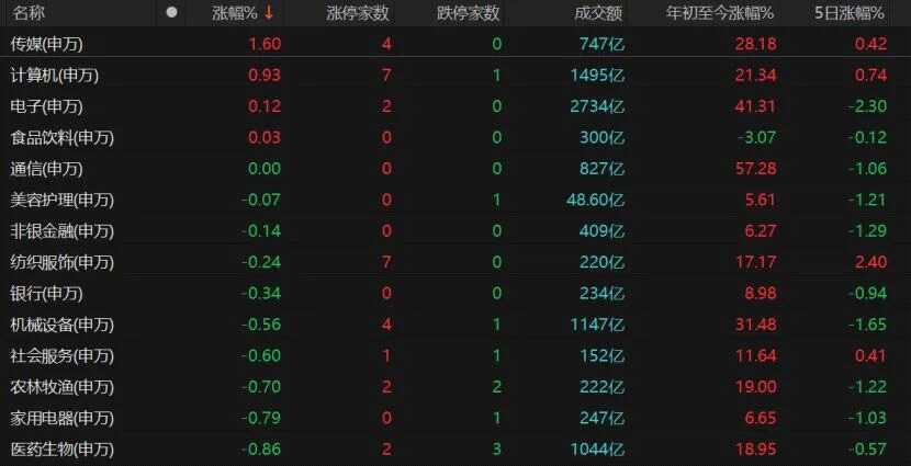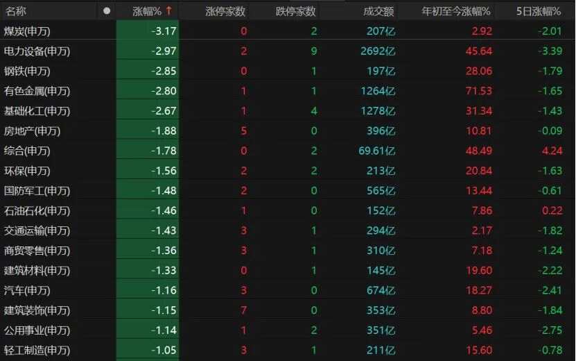 31個(gè)申萬(wàn)一級(jí)行業(yè)中有26個(gè)板塊收跌,跌幅超過(guò)1%的有17個(gè),煤炭、電力設(shè)備、鋼鐵、有色金屬、基礎(chǔ)化工跌幅均約3%,房地產(chǎn)、環(huán)保、國(guó)防軍工、石油石化、交通運(yùn)輸、商貿(mào)零售、建筑材料、汽車等板塊也飄綠。