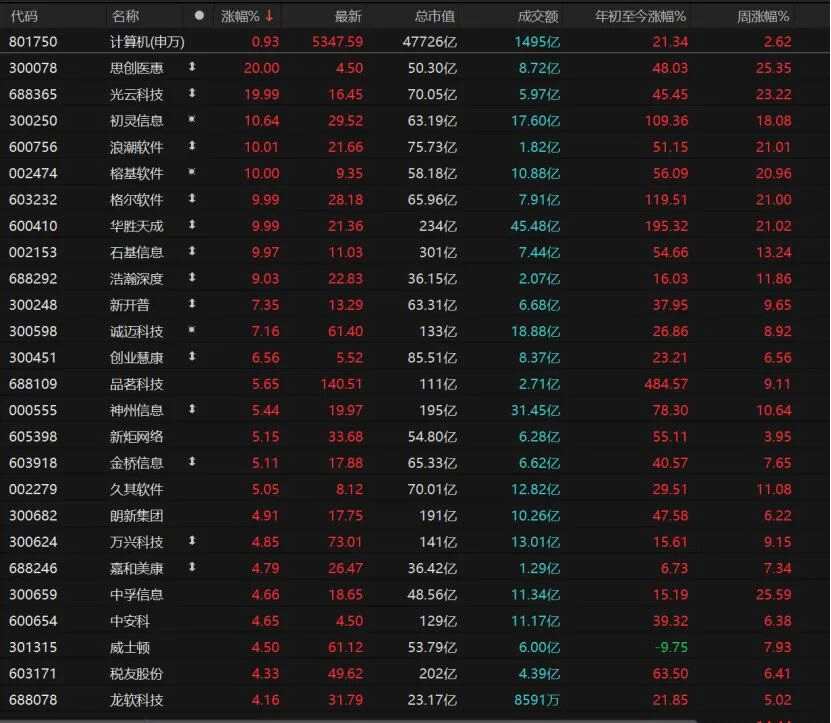 計(jì)算機(jī)板塊掀起漲停潮,思創(chuàng)醫(yī)惠(300078)、光云科技“20cm”漲停,浪潮軟件(600756)、榕基軟件(002474)、格爾軟件(603232)、華勝天成(600410)、石基信息(002153)漲停。