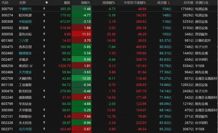 1277只個(gè)股收漲,漲停股62只;4106只個(gè)股收跌,跌停股36只。今日成交額超過(guò)100億元的共計(jì)5只,藍(lán)色光標(biāo)(300058)漲近12%報(bào)9.69元/股,近一周漲幅累計(jì)超過(guò)25%;電源設(shè)備個(gè)股寧德時(shí)代(300750)跌逾1%,陽(yáng)光電源(300274)跌近5%;光模塊個(gè)股中際旭創(chuàng)(300308)跌逾2%,新易盛(300502)則漲近2%。