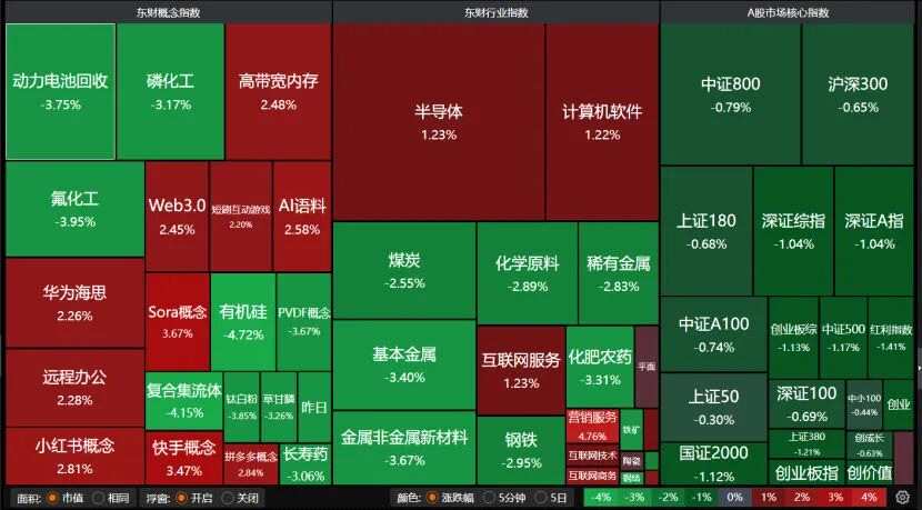 盤面上,半導(dǎo)體、計(jì)算機(jī)軟件、華為海思、Sora概念收漲,但動(dòng)力電池回收、磷化工、氟化工、有機(jī)硅、長(zhǎng)壽藥、煤炭、基本金屬、鋼鐵等概念跌幅較大。