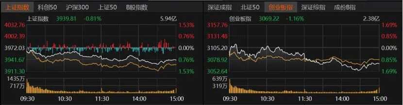 指數(shù)方面,滬指收跌0.81%報(bào)3939.81點(diǎn),創(chuàng)業(yè)板指收跌1.16%報(bào)3069.22點(diǎn),深證成指跌近1%。計(jì)算機(jī)、電子板塊微紅,科創(chuàng)50收紅,滬深300、上證50微跌,北證50跌近3%。