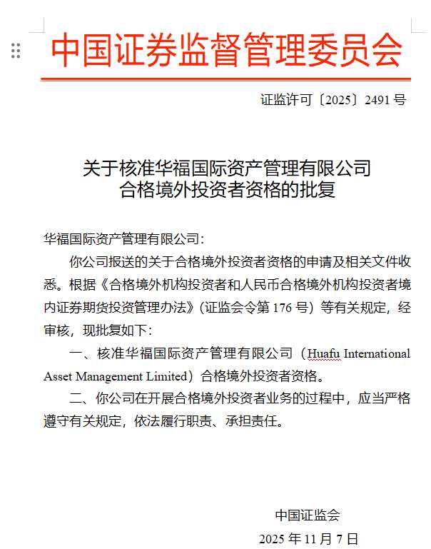 據(jù)悉,今年中國證監(jiān)會、中國人民銀行、國家外匯管理局共同推動實施合格境外投資者資格審批與開戶“高效辦成一件事”,中國證監(jiān)會于2025年10月27日發(fā)布合格境外投資者資格審批與開戶“一件事”《服務(wù)指南》。其中明確指出,合格境外投資者資格許可法定時限為10個工作日,承諾辦理時限5個工作日。華福國際資產(chǎn)管理有限公司是新的《服務(wù)指南》實施后,首家遞交材料后獲批的合格境外投資者。