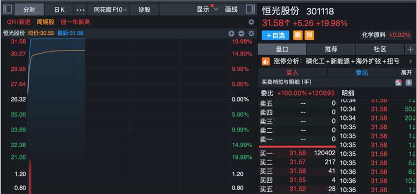 盤初,磷化工概念拉升,恒光股份(301118)“20cm”漲停,川能動力(000155)漲停,澄星股份(600078)、云圖控股(002539)跟漲。