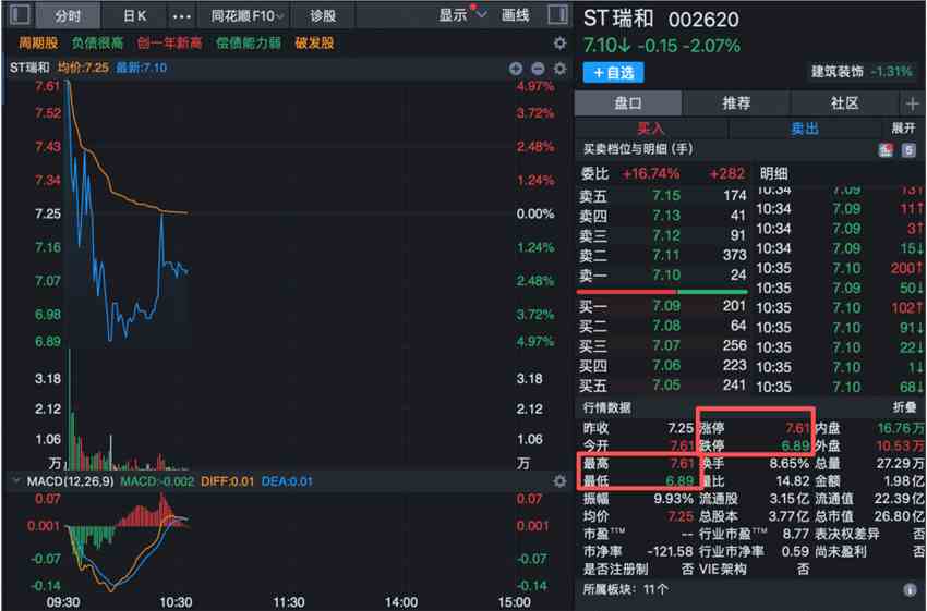 個股方面,【ST瑞和(002620)、股吧】(002620)(002620)盤中觸及跌停,上演“天地板”,成交額接近2億元。