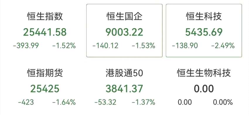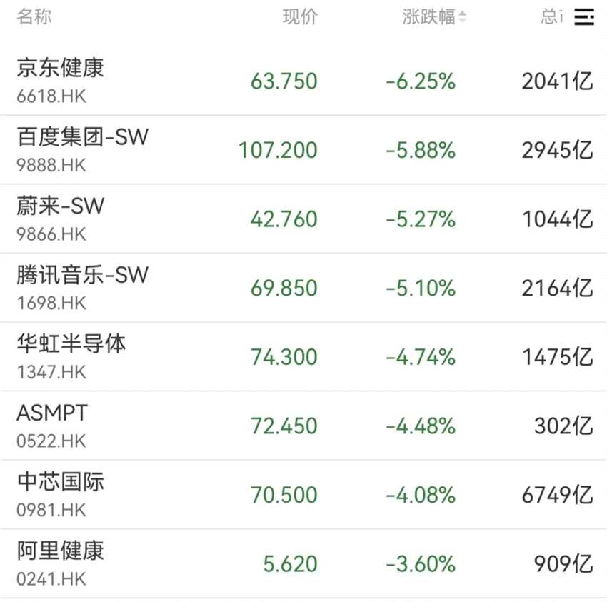 港股恒生科技指數(shù)跌超2%,京東健康、百度集團(tuán)、蔚來均跌超5%。