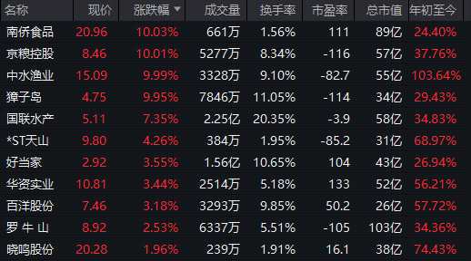 此外,食品零售概念震蕩拉升,南僑食品(605339)、京糧控股(000505)、中水漁業(yè)(000798)、獐子島(002069)等多股漲停。