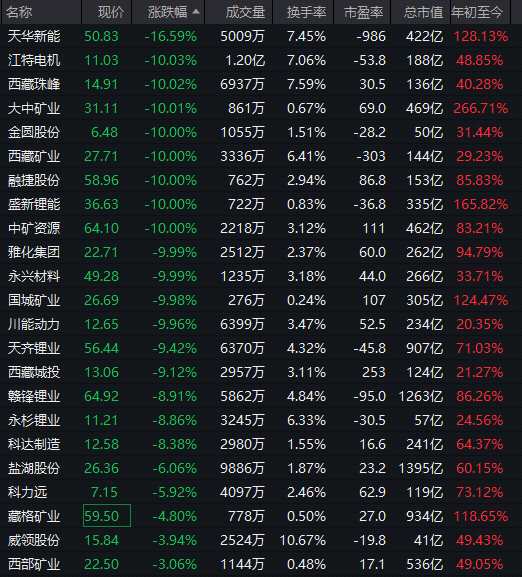 鋰礦股集體走低,大中礦業(yè)(001203)、金圓股份(000546)、融捷股份(002192)、雅化集團(tuán)(002497)等多股跌停,天齊鋰業(yè)(002466)、贛鋒鋰業(yè)(002460)均跌超8%。