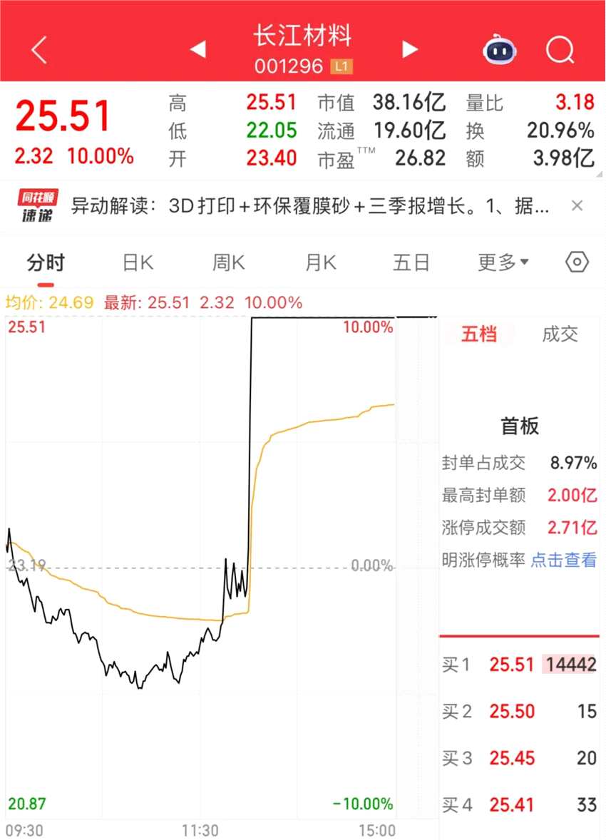 3D打印概念股午后局部異動,長江材料直線漲停,家聯(lián)科技(301193)、長盈精密(300115)漲超3%。截至收盤,長江材料報25.51元/股,總市值38.16億元,封單數(shù)量超1.4萬手。