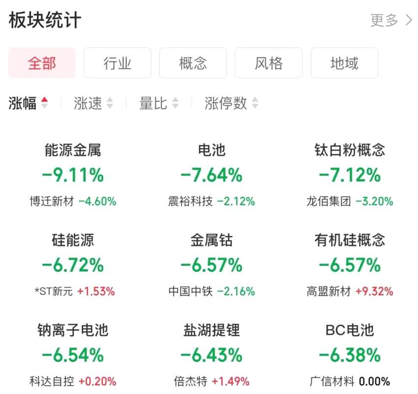前期熱門板塊今日大幅調(diào)整,有色金屬、電池相關(guān)等多個板塊大跌。截至收盤,能源金屬大跌9.11%,電池跌7.64%,硅能源、有機硅概念、鈉離子電池、鹽湖提鋰等多個板塊跌超6%。