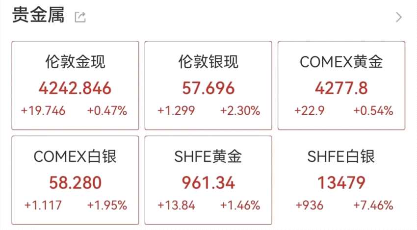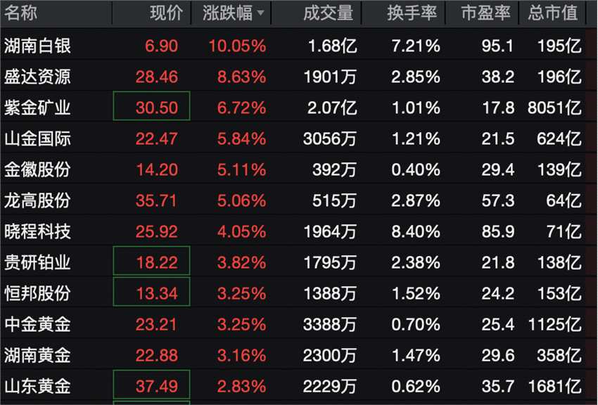 早盤(pán)貴金屬概念股拉升,湖南白銀(002716)漲停,盛達(dá)資源(000603)、紫金礦業(yè)(601899)、山金國(guó)際(000975)等跟漲。