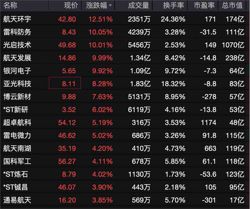 航天軍工概念早盤(pán)走高,雷科防務(wù)(002413)、光啟技術(shù)(002625)、航天發(fā)展(000547)等多股漲停。