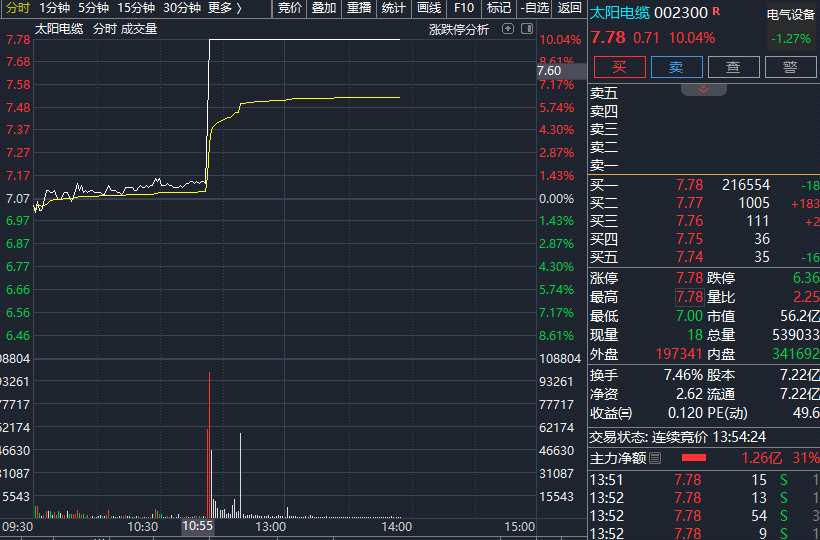 在上述消息的刺激下,12月2日盤中,福建板塊多只跟算力相關的股票大幅異動。其中,太陽電纜(002300)從拉升動作開始至漲停板,用時僅2分鐘。鴻博股份(002229)盤中也一度觸板,恒鋒信息(300605)一度大漲超16%。