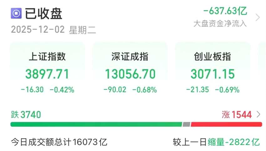12月2日,A股震蕩調(diào)整,熱門題材快速輪動。截至收盤,上證指數(shù)跌0.42%,深證成指跌0.68%,創(chuàng)業(yè)板指跌0.69%。全市場成交額16073億元。