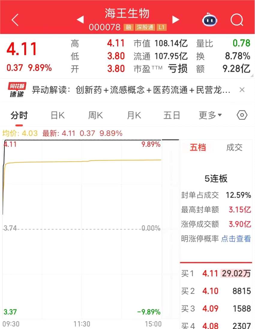 海王生物收獲“五連板”