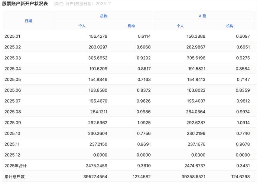 上交所官網(wǎng)發(fā)布的新開戶數(shù)據(jù)顯示,2025年11月A股新開戶238萬戶,其中,個人投資者開戶237.17萬戶,機構(gòu)投資者開戶0.9678萬戶。