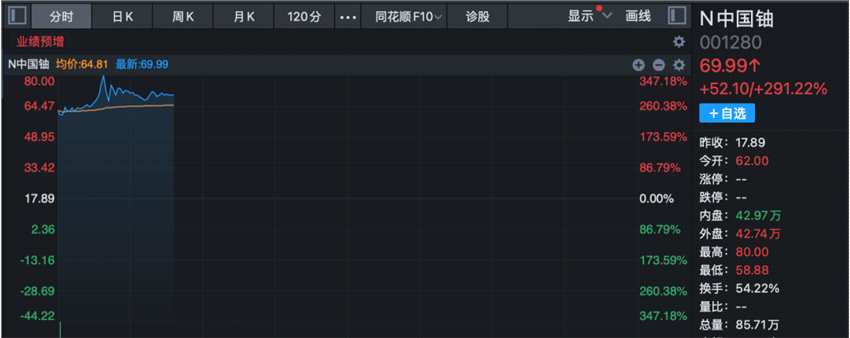 12月3日,新股【中國鈾業(yè)(001280)、股吧】(001280)(001280)上市,盤中最高漲幅超345%,截至發(fā)稿,最新漲幅為291.22%,總市值超1400億元。