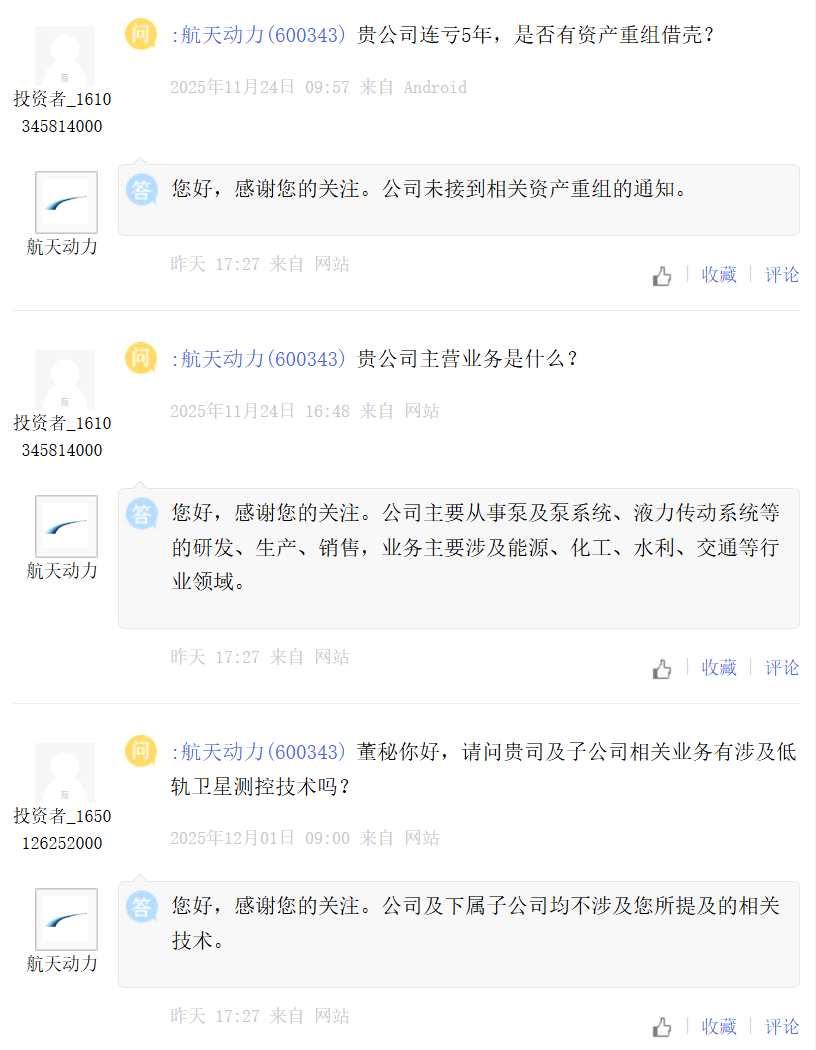 12月2日,航天動(dòng)力在投資者互動(dòng)平臺(tái)上回復(fù)多個(gè)問(wèn)題。航天動(dòng)力提到,公司及下屬子公司均不涉及低軌衛(wèi)星測(cè)控相關(guān)技術(shù),公司未接到相關(guān)資產(chǎn)重組的通知等。