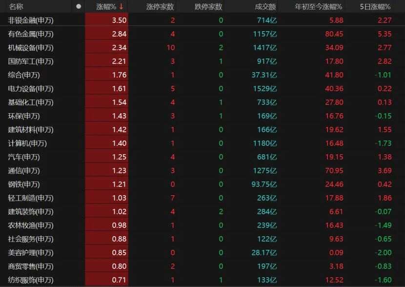 板塊收漲居多,31個申萬一級行業(yè)中,銀行板塊微跌;非銀金融板塊午后拉升,大漲3.5%,中銀證券(601696)、瑞達(dá)期貨(002961)漲停;有色金屬概念漲近3%,精藝股份(002295)、寧波韻升(600366)、西部材料(002149)、閩發(fā)鋁業(yè)(002578)漲停。機械設(shè)備、國防軍工、電力設(shè)備、基礎(chǔ)化工、計算機、汽車、通信等板塊漲幅均超過1%。