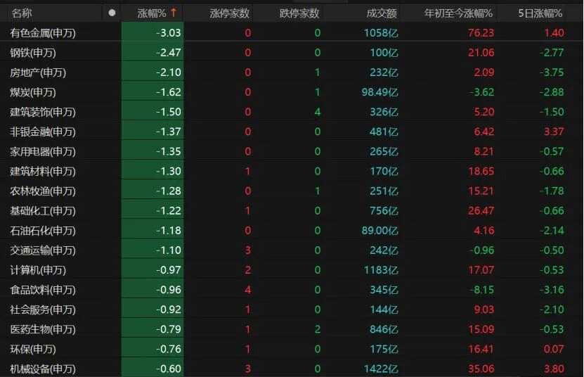 有色金屬、鋼鐵、房地產(chǎn)板塊領(lǐng)跌,煤炭、建筑裝飾、家用電器、建筑材料等板塊均跌逾1%,非銀金融板塊今日回落。
