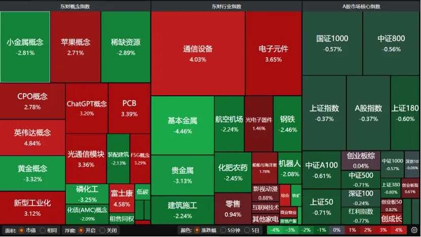 盤面上,科技股仍是資金偏愛方向。CPO概念繼續(xù)走高,通信設(shè)備、電子元件、光電子器件、新型工業(yè)化、英偉達概念大漲。但基本金屬、黃金概念、航空機場、貴金屬、化肥農(nóng)藥、建筑施工、鋼鐵、機器人等概念跌幅明顯。