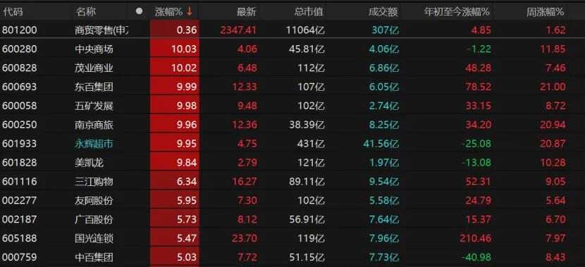 商貿(mào)零售概念逆市抬頭,中央商場(600280)、茂業(yè)商業(yè)(600828)、東百集團(600693)、五礦發(fā)展(600058)、南京商旅(600250)、永輝超市(601933)、美凱龍(601828)7只相關(guān)個股漲停。
